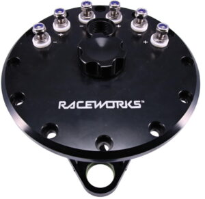 The Raceworks Hanger is designed for fitting into the ALY-27xBK range of Fuel Cells, or may be used in a custom fuel tank through the use of a steel or aluminium weld ring. It holds 1-3 pumps of diameter 39-40mm.