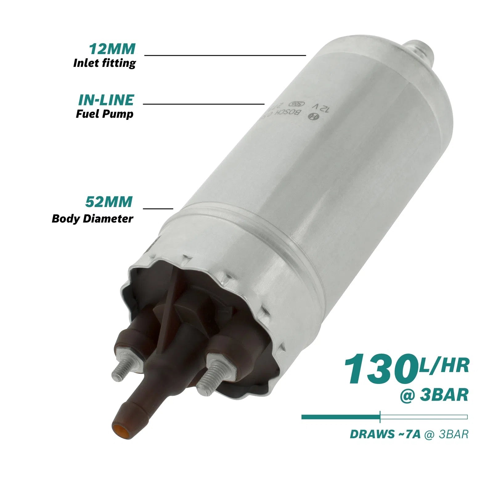 130l/h @3bar In-line Fuel Pump. Suitable for EFI conf=versions up to 300hp.Description