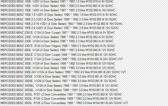Suits Mercedes Benz180e, 190e, 230CE,300CE, 300SE, 300SE, 300SEL, 300SL